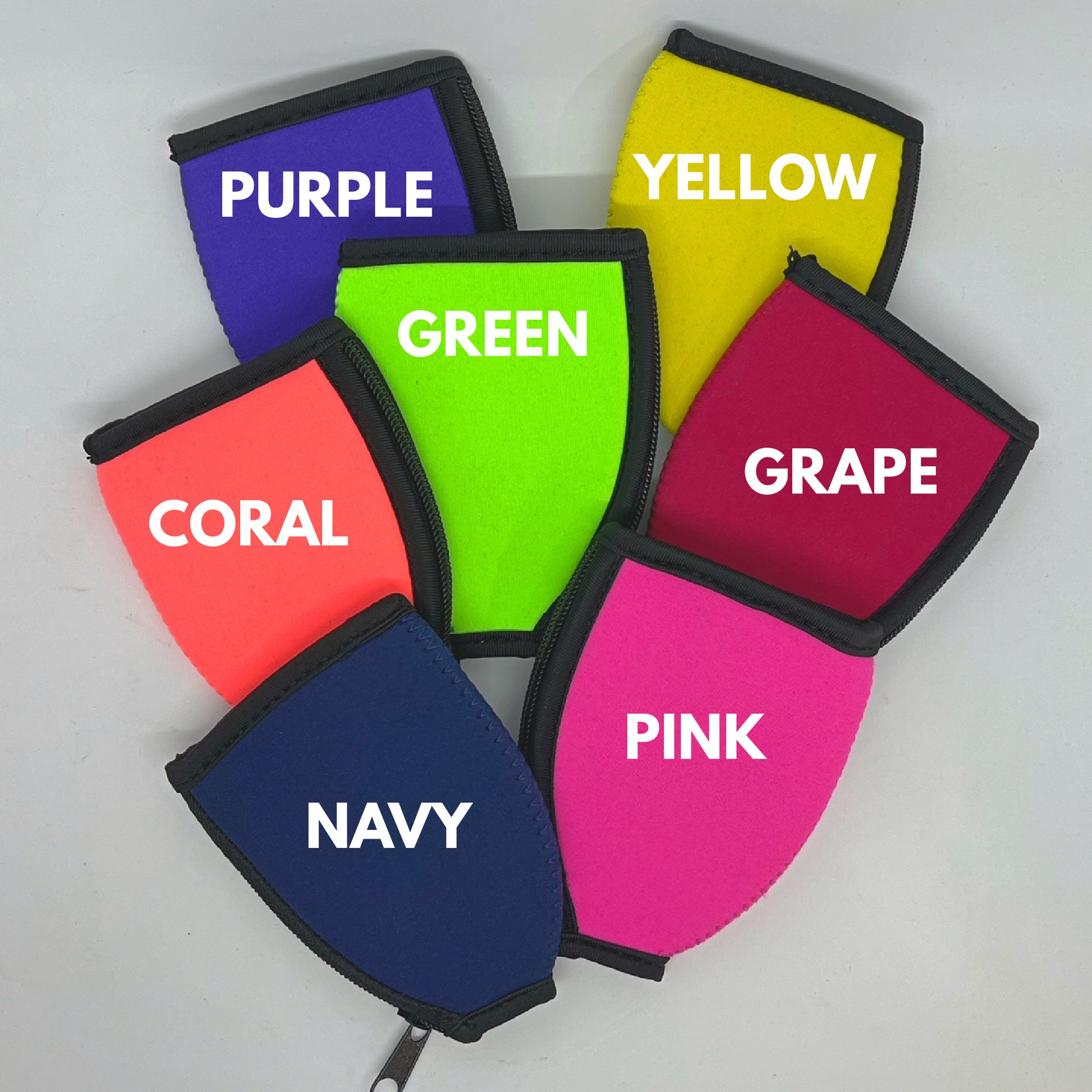 The coolers come in 7 colours - navy, lime green, coral, pink, purple, grape and yellow. Select at checkout what you would prefer. Names or pictures will be applied in white.